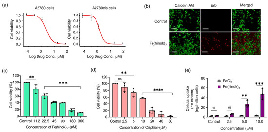Results of cytotoxicity studies: (a) representative killing curves of Fe(hinok)3 against A2780 (cisplatin−sensitive) and A2780cis (cisplatin−resistant) ovarian cancer cell lines; (b) representative images of live/dead cell assays of A2780cis cells treated with Fe(hinok)3 (scale bar = 200 µm); (c) cell viability curve of Fe(hinok)3 against HEK 293 cells; (d) cell viability curve of cisplatin against HEK 293 cells; and (e) cellular uptake of Fe(hinok)3 in A2780cis as determined by the Fe content in the cell lysate (data presented as mean ± s.d, n =3 replicates; ** p < 0.01, *** p < 0.001, **** p < 0.0001 and ns = not significant).