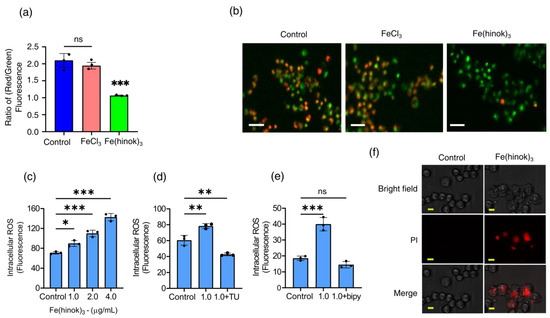 Assessment of mitochondrial depolarization using JC–1 dye: (a) the change in the ratio of red/green fluorescence signals in A2780cis cells treated with FeCl3 and Fe(hinok)3 each at the concentration of 1.0 µM over 24 h; (b) representative microscopic images of JC–1 fluorescent signals in A2780cis cells treated with FeCl3 and Fe(hinok)3 each at 1.0 μM, (scale bar = 100 µm); (c) production of ROS following Fe(hinok)3 treatment with varying concentrations in A2780cis cells; (d) effect of free radical scavenger thiourea (TU) on cell viability; and (e) effect of Fe(II) chelator (bipy) on the intracellular ROS production in A2780cis cells (data presented mean ± s.d, n = 3 replicates; * p < 0.05, ** p < 0.01, *** p < 0.001 and ns = not significant); and (f) effect of Fe(hinok)3 on the cell membrane permeability and damage in the A2780cis cells showing representative microscopic images of PI in the A2780cis cells treated with Fe(hinok)3 at 8 μM. Differential interference contrasts microscopic (DIC) images (top), fluorescence images (middle) and merged images of the A2780cis cells (bottom) (scale bar = 30 µm).