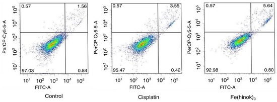 A2780cis cells were seeded in a 6-well plate at a concentration of 2 × 105 cells/well and incubated for 24 h at 37 °C. Then, the cells were treated with Fe(hinok)3 (1.0 µM) or cisplatin (10 μM) and untreated control group. Cells were then incubated for 72 h at 37 °C. The medium was collected in clean 15 mL falcon tubes along with washed PBS 1× and pH 7.4 solution. A volume of 1 mL trypsin was added to the wells. After 5 min, cell suspensions were transferred to the falcon tubes that contained the media and PBS 1× and pH 7.4 and centrifuged at 400–500× g at 4 °C for 5 min. The cell pellet was re-suspended in 1 mL PBS 1× and pH 7.4 and the cells were counted. The cell pellet was collected again and the appropriate amount of 1× binding buffer was added to make a concentration of 106 cells/mL. Next, 100 μL cell suspensions were added to new 2 mL Eppendorf tubes and 5 μL Annexin V-FITC was added to one tube and 5 μL PI solution was added to another. Cells were gently vortexed and incubated at room temperature for 15 min in the dark; 400 µL 1× binding buffer was added to each Eppendorf tube and the cell suspensions were transferred to flow cytometry tubes. Flow cytometry analysis was done using FL-1 and FL-2 channels on a FACSAria™II flow cytometer (BD Biosciences, Franklin Lakes, NJ, USA).