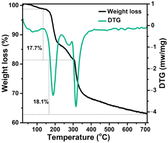The TIPT process of β-Co(OH)2 was also investigated using thermogravimetric (TG) analysis under an H2/Ar atmosphere (10% H2). As shown in Figure 2, the mass loss below 405 K was attributed to the elimination of water adsorbed on the surface of the nanosheets. The thermal decomposition of β-Co(OH)2 to CoO was responsible for the 17.7% mass loss between 405 and 583 K, whereas the reduction of CoO to Co was responsible for the mass loss between 583 and 973 K. The total weight loss from 405 to 973 K was 35.8%, close to the theoretical weight loss of the transformation from β-Co(OH)2 to Co (36.6%). The XRD and TG results of the TIPT process of β-Co(OH)2 nanosheets reveal the occurrence of a sequence of crystalline phase transformations during the reduction process: β-Co(OH)2 → CoO → HCP-Co → HCP-FCC-Co → FCC-Co. It indicates that the TIPT method allows the Co phase to be precisely controlled by varying the reduction temperature [31]. In addition, it is worth noting that the different crystal phases of cobalt exhibited various exposed facets, likely affecting the catalytic properties of the cobalt catalysts [29].