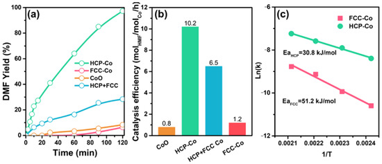 The hydrogenation of the biomass platform molecule HMF was selected to test the catalytic properties of the as-prepared cobalt catalysts. The functional groups (C=O, C=C, C–O, and furan ring) of the HMF molecule make it suitable for further hydrogenation conversions. As shown in Scheme 1, the main products of HMF hydrogenation could be BHMF, 5-methylfurfural (5-MF), 5-methylfurfurylalcohol (MFA), and the final product DMF. The hydrogenation of HMF is a cascade of reactions, and the selectivity to DMF strongly depends on the HMF conversion. The results of HMF hydrogenation over the as-prepared CoO, HCP-Co, FCC-Co, and mixed-phase Co (with dual HCP-Co and FCC-Co) catalysts are displayed in Figure 3 and Figure S2. As shown in Figure S2, the CoO catalyst exhibited inferior catalytic activity and selectivity to DMF (<20%) due to the absence of the metallic phase. In contrast, the HCP-Co catalyst showed outstanding catalytic performance in the hydrogenation of HMF to DMF, with a 97.3% DMF yield under 100% HMF conversion (Figure 3a and Figure S2). In addition, the cobalt catalyst obtained whilst using a higher reduction temperature, with mixed HCP-Co/FCC-Co phases, exhibited poor catalytic activity and selectivity compared to HCP-Co. FCC-Co exhibited inferior activity and the lowest DMF yield (6.4%) for HMF hydrogenation. It is worth noting that the activity of the as-prepared catalysts is strongly dependent on the crystal phase of cobalt. Similarly, as shown in Figure 3b, the cobalt catalyst with pure HCP phase exhibited the maximum CE (10.2 molHMF·molCo−1·h−1), whereas a lower CE was observed over HCP-FCC-Co. Furthermore, the HCP-Co catalyst showed an 8.5-fold increase in CE compared to its counterpart FCC-Co (1.2 molHMF·molCo−1·h−1). It indicated that FCC-Co was less active for HMF hydrogenation, and increasing the proportion of the FCC-Co phase in the Co catalysts would cause a decrease in the activity for HMF hydrogenation. These results strongly confirm the key role of the Co phases in the hydrogenation of HMF to DMF. Furthermore, the apparent activation energies (Ea) for HMF hydrogenation over HCP-Co and FCC-Co were also calculated (see details in Figure S3 and Table S2). As shown in Figure 3c, the Ea for HMF hydrogenation over HCP-Co was 30.8 kJ/mol, much lower than that over FCC-Co (51.2 kJ/mol). Lyu et al. reported that the activation barrier for CO dissociation on the (110) facet of HCP-Co (1.39 eV) was ca. 1.09 eV lower than that on the dominating (111) facet of the FCC-Co crystal phase (2.48 eV) [33]. Similarly, the calculated reaction rate of ammonia synthesis on the (110) facet was much higher than that on the (111) facet of FCC-Co [36]. Therefore, the difference in the catalytic performances of the HCP-Co and FCC-Co catalysts observed in this study could be ascribed to the different crystal faces exposed on their crystalline phases, which led to various HMF hydrogenation activities.