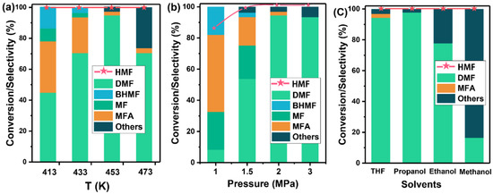 Further tests were conducted to evaluate the catalytic performance of the HCP-Co catalyst in the hydrogenation of HMF to DMF. As shown in Figure 4a, 100% HMF conversions were obtained over the HCP-Co catalyst at all different temperatures, while the DMF selectivities varied; in particular, the latter were only 44.5% and 71.5% at 413 and 433 K, respectively. With increasing temperature, a maximum DMF yield of 97.3% was obtained at 453 K. However, a higher reaction temperature (473 K) leads to a decrease in DMF selectivity (71.0%), owing to the formation of humins (as discussed along with the TG characterization results below). As shown in Figure 4b, the conversion of HMF increased from 83.2% at 1 MPa to 100% at 2.0 MPa, leading to the DMF yield increasing from 8.9% to 97.3%. Upon further increasing the reaction pressure to 3 MPa, the DMF yield slightly decreased to 93.3% due to the formation of excessive hydrogenation products. In addition, different solvents resulted in significant changes in the selectivity to DMF over the HCP-Co catalyst (Figure 4c). The DMF selectivity was >95% in THF and 2-propanol but ca. 80% selectivity in ethanol and less than 20% in methanol. The low selectivity to DMF in ethanol and methanol could be attributed to the etherification reaction to form ethers [39,40].