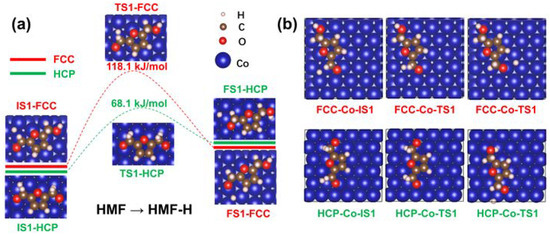 According to the DFT calculations, the (110), (102), and (100) planes dominated the HCP-Co Wulff shape, whereas the (111) plane occupied most of the surface of FCC-Co [35]. Therefore, to clarify the significant difference in the hydrogenation performance of these Co catalysts with different phases, DFT calculations were performed to investigate the reaction energy barriers for the first step of HMF hydrogenation on HCP-Co (110) and FCC-Co (111) facets [49]. In the initial state, HMF is adsorbed on the surface of the Co site, and the two H atoms from the H2 dissociation are adsorbed nearby. According to a previous study, the two dissociated H atoms tend to hydrogenate the first carbonyl carbon and then the carbonyl oxygen atom [50]. The potential changes along the reaction coordinate on the HCP-Co and FCC-Co surfaces are shown in Figure 5a. The transition state (TS) barrier of HMF hydrogenation on the surface of HCP-Co (110) was 68.1 kJ/mol, which was much lower than that on the surface of FCC-Co (111). Therefore, the lower energy barrier of the first step of HMF hydrogenation on the HCP-Co surface is contributed to its high activity in the HMF hydrogenation.