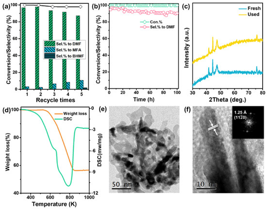The recyclability and stability of the HCP-Co catalyst were tested using a batch and a fixed-bed reactor, respectively. As shown in Figure 6a, only a 3% reduction in HMF conversion was observed after a five-times cycle test in the batch reactor. At the same time, the selectivity to DMF changed from 97% to 87%. A similar trend was observed when HCP-Co was used in the fixed-bed reactor (Figure 6b). The conversion of HMF remained at 99%, while the DMF selectivity showed a slight decrease. The used HCP-Co catalyst was characterized to uncover the reason for the decrease in catalytic capacity. As shown in Figure 6c, the used catalyst maintained the HCP phase, and the calculated particle size was similar to that of the fresh HCP-Co catalyst (Table S1). TG analysis was conducted to examine the carbon deposition on the spent HCP-Co catalyst after a 100 h test. As shown in Figure 6d, a sharp weight decline was observed at around 788 K in the TG–DTG curve, resulting from the formation of humins (polymerization of HMF) and carbon deposition [12]. Similarly, as shown in Figure 6f, an amorphous layer covered the surface of HCP-Co. The deposited carbonaceous material may deactivate the catalyst by covering the active sites or through pore blocking [51,52]. It indicated that the activity loss could be ascribed to the carbon deposition on the surface of HCP-Co. Moreover, the morphology of the spent catalyst appeared to be slightly different from that before the reaction (Figure 1c). The change in the morphology of the used cobalt catalyst would also result in deactivation. Therefore, the difference in the morphology HCP-Co could be another cause for its deactivation during the stability test.