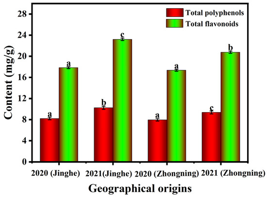 A comparison of the total polyphenolic and flavonoid contents of L. barbarum fruits harvested in summer 2020 and 2021 from different geographical origins. Different letters (a, b, c) across treatments indicate significant differences at p < 0.05.