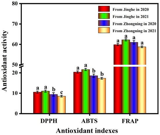 The antioxidant activity of L. barbarum fruits grown in different geographical origins. Different letters (a, b, c) across treatments indicate significant differences at p < 0.05.