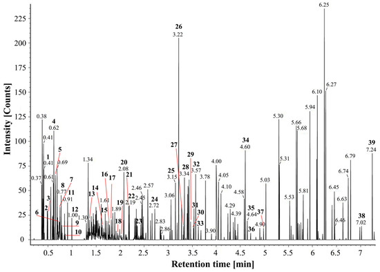 Total ion chromatogram of L. barbarum fruit extract in positive-ion mode (Numbers 1–39 represent different characteristic peaks recognized).