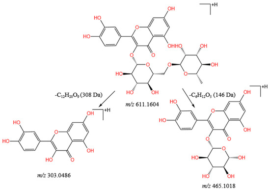 Flavonoids consists of three ring skeletons, C6-C3-C6, which are derived from the parent nucleus of flavone (2-phenylchromone) [37]. Twenty-six flavonoids were identified accurately in the L. barbarum fruit extract by comparing the Waters Progenesis QI database and previous literature reports, including flavanones (compound 15), flavones (compound 9), flavonols (compounds 2, 18, 21, 22, and 25–32), chalcone (compound 35), flavanes (compounds 7, 16, 17, and 33), and anthocyanidins (compounds 1, 3, 10, 13, 24, 36, and 37). Taking compound 25 in Table S4 as an example, the main cracking mechanism of this compound was analyzed. The retention time of compound 25 was 3.22 min, and it had a protonated molecular ion [M + H]+ at m/z 611.1604. Compound 25 generated MS/MS characteristic ions at m/z 465.1018 (isoquercetin [M + H]+) and at m/z 303.0486 (quercetin [M + H]+), because m/z 611.1604[M + H]+ lost 146 Da (rhamnoside) and 308 Da (rutinoside) [38]. The main cleavage pathway is shown in Figure 4. By comparing the retention time and MS/MS fragment information with the rutin reference substance, compound 25 was presumed to be rutin. This speculation was consistent with previous reports [39,40].