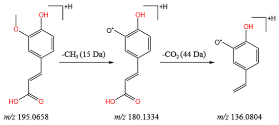 Phenolic acids are compounds with phenolic groups and organic carboxylic acid functional groups, and most of them are hydroxybenzoic acid derivatives with a C6-C1 skeleton and hydroxycinnamic acid derivatives with a C6-C3 skeleton [41,42]. They have potential biological properties such as antioxidation, antiviral, antibacterial, and anti-inflammatory activities [43]. A total of 11 phenolic acids were accurately identified in the L. barbarum fruit extract, including hydroxybenzoic acids (compounds 6, 11, 12, and 38) and hydroxycinnamic acids (compounds 4, 8, 14, 20, 23, and 34). Taking compound 20 in Table S4 as an example, the main cracking process of phenolic acid compounds was analyzed. The retention time of compound 20 was 2.08 min. By comparing MS/MS fragment information with the rutin reference substance and related literature [44], compound 20 with m/z at 195.0658 [M + H]+ was determined as ferulic acid, because it showed characteristic MS/MS ions at m/z 180.1334 [M−CH3 + H]+ and m/z 136.0804 [M−CH3−CO2 + H]+ (Figure 5).