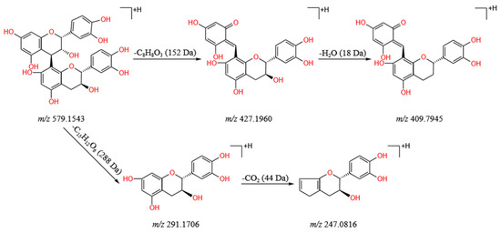 Tannins are water-soluble polyphenols with a relative molecular mass of between 500 and 3000, which exist widely in plants. Three tannins (compounds 5, 19, and 39) were accurately identified in the L. barbarum fruit extract. Taking compound 19 in Table S4 as an example, the main cracking mechanism of tannins was analyzed. The retention time of compound 19 was 2.03 min, and its protonated molecular ion was at m/z 579.1534 [M + H]+. As shown in Figure 6, compound 19 showed fragment ions at m/z 427.1960 [M−C8H8O3 + H]+; m/z 409.7945 (loss of C8H8O3 and H2O, respectively); m/z 291.1706 [M−288 + H]+; and 247.0816 [M−288−CO2 + H]+. By comparing the retention time, the Waters Progenesis QI database, and a previous report [45], compound 19 was inferred to be procyanidin B1.