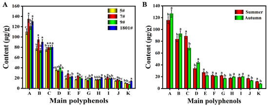 Comparison of the main polyphenolic contents of fruits from different varieties of L. barbarum (A) harvested during different seasons (B). (A, rutin; B, p-coumaric acid; C, ferulic acid; D, quercetin; E, kaempferol-3-O-rutinoside; F, isoquercetin; G, chlorogenic acid; H, isorhamnetin-3-O-rutinoside; I, isorhamnetin-3-glucoside; J, isorhamnetin; K, caffeic acid). Different letters across treatments (a, b, c, d) indicate significant differences at p < 0.05.