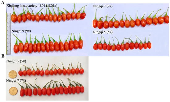 (A) Four varieties (1801#, 7#, 9#, and 5#) of fresh L. barbarum fruits from Jinghe Xinjiang and (B) two varieties (5# and 7#) of fresh L. barbarum fruits from Zhongning.