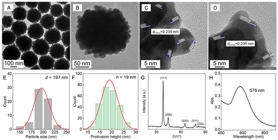 AuNFs synthesized in PVP (50 g∙L−1)–SDS (5 mmol·L−1)–HAuCl4 (0.25 mmol·L−1) solution characterized by (A,B) TEM, (C,D) HRTEM, (E) size distribution, (F) nano-protrusion height distribution, (G) XRD, and (H) LSPR.