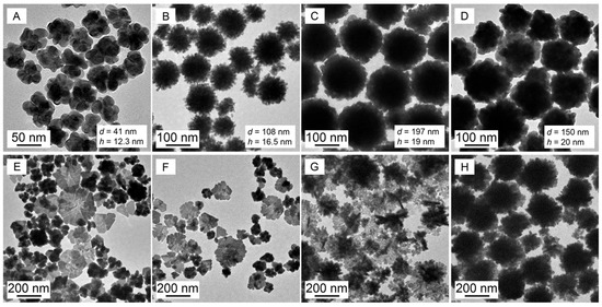 TEM images of Au nanoparticles growing in PVP (50 g·L−1)–SDS–HAuCl4 (0.25 mmol·L−1) solutions with c(SDS) at (A–H) 0, 2, 5, 15, 30, 45, 50 and 60 mmol·L−1. The data of d and h present the particle size and the protrusion height, respectively.
