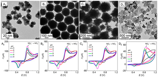 TEM images (A1–D1) of the Au nanoparticles growing in PVP–SDS–HAuCl4 and the CV plots (A2–D2) referring to the electrocatalytic oxidation of nitrites (5 mmol·L−1) detected by the corresponding Au/GCE at different pH values. A scan rate of 50 mV∙s−1 and 10 scanning turns; (A) the AuND/GCE in PVP (10 g·L−1)–SDS (5 mmol·L−1)–HAuCl4 (0.25 mmol·L−1), (B) the AuNF/GCE in PVP (50 g·L−1)–SDS (5 mmol·L−1)–HAuCl4 (0.25 mmol·L−1), (C) the 2D-AuNF/GCE in PVP (50 g·L−1)–SDS (60 mmol·L−1)–HAuCl4 (0.25 mmol·L−1), and (D) the AuNP/GCE in PVP (50 g·L−1)–SDS (5 mmol·L−1)–HAuCl4 (1.0 mmol·L−1).
