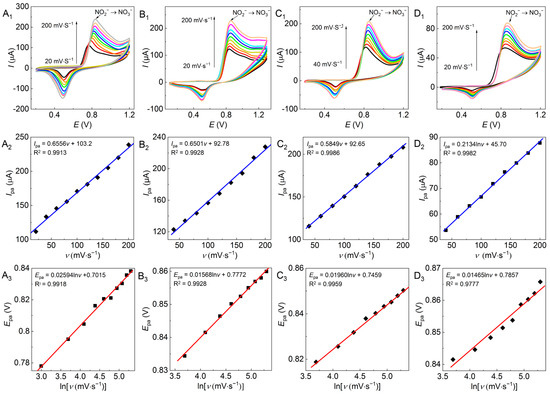 As shown in Figure 6, all assayed Au/GCEs presented an effective electrochemical response on NO2−. The Ipa increased linearly with the increase in the scan rate (Figure 6A2–D2), indicating that the electron transfer of NO2− to NO3− on these Au/GCEs was controlled by the adsorption step [39]. Meanwhile, lnv presented a linear relation with Epa (Figure 6A3–D3), which is consistent with the literature [8].