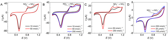 With unmodified GCE, NO2− at 5 mmol·L−1 (pH 7) induced an oxidation shoulder peak at 0.820 V with a corresponding redox potential difference of 0.310 V on the CV plots (Figure 5A), and the oxidation peak current (Ipa) was only 15 µA, which was too low to determine the electrochemical behavior of NO2−. However, on all tested Au/GCEs, as shown in Figure 4A2–D2, NO2− (5 mmol·L−1 at pH 5–9) provided an obvious sharp oxidation peak with a narrow oxidation peak potential (Epa) within 0.800–0.820 V except in Figure 4D2, which shows an undesired wide potential variation of 0.810–0.920 V. Meanwhile, the Ipa values in Figure 4A2–C2 are as high as 120−150 µA compared to 50 µA in Figure 4D2, that is, they are all much higher than that of the bare GCE in Figure 5A (15 µA).