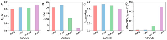(A) Epa and (B) Ipa values of four Au/GCEs that detected nitrites (5 mmol·L−1) at pH 7, (C) AAu/GCE/AGCE, and (D) the LOD of NO2− detected by these Au/GCEs.