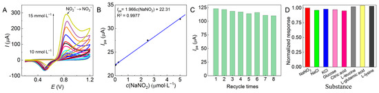 (A) CV plots and (B) Ipa–c(NO2−) of the AuNF/GCE in electrocatalytic oxidation of nitrites at different c(NO2−) values of 0.01–5.00 µmol·L−1 and pH 7 with a scan rate of 50 mV∙s−1 and 10 scanning turns, and (C) repeatability of and (D) interference of the optimal AuNF/GCE.
