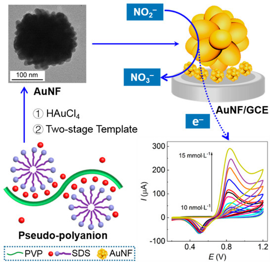 Schematic mechanism of nitrite detection with the optimal AuNF/GCE synthesized by the PVP–SDS pseudo-polyanions with a two-stage soft template function.