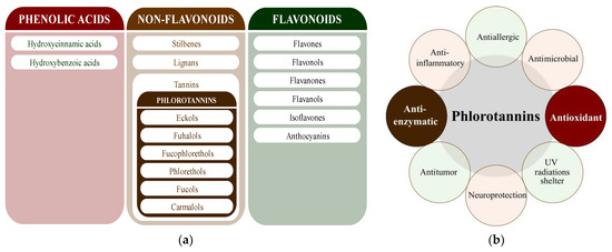 (a) Main three chemical families of polyphenols; (b) Main biological activities of phlorotannin’s.
