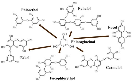Phlorotannins are moderately hydrophilic components with a wide range of molecular weights, ranging between 126 and 650 kDa. They are produced via the polymerization of the phloroglucinol molecule (benzene-1,3,5-triol) through the polyketide pathway reaction and stored in physodes and/or cell-wall-forming complexes. The content of phlorotannins in seaweeds depends on environmental conditions, such as tides, salinity, light availability, UV radiation, and herbivory intensity. These compounds are divided into six different classes according to the variations in their assemblage and distribution of hydroxyl groups: eckols, fuhalols, fucophlorethols, phlorethols, fucols, and carmalols (Figure 4). Phlorethols and fuhalols present aryl–ether linkages, fucols aryl–aryl bonds, fucophlorethols, and a mixture of ether and phenyl bonds; eckols present a 1,4-dibenzodioxin unit. Carmalols present a 4-dibenzodioxin unit at the third and seventh positions. Eckols differ from carmalols in their lower molecular weight and the presence of an OH group substituted at the fourth carbon; fuhalols differ from phlorethols in their regular sequence of para- and ortho-ether bonds, the presence of additional OH groups in every third ring, and the lack of one or more OH groups in the whole molecule [,,].