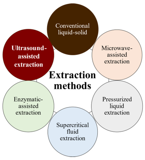 Pressurized liquid extraction (PLE) utilizes high pressures (up to 15 MPa) and temperatures (up to 200 °C), along with low extractant volumes and short extraction times, whereas microwave-assisted extraction (MAE) uses electromagnetic waves to induce and facilitate compound extraction. However, both methods promote the partial degradation of thermolabile compounds []. Supercritical fluid extraction uses fluids with a temperature and pressure above their critical point (most often CO2) to increase mass transfer by decreasing surface tension and viscosity, but it is less used because of the high costs of equipment and solvent (if no solvent is recovered); additionally, for optimal results, the solvent polarity must be tuned by adding polar compounds (alcohols) to CO2 for phenolics extraction [].