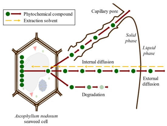 Conventional SLE, also known as leaching, is a widely used method in the food industry to extract various compounds such as sucrose, lipids, proteins, phenolic compounds, and hydrocolloids [,,]. Molecular diffusion is the primary transport mechanism in this process, where compounds are transported by a concentration gradient in the solid phase. The microstructure of the solids plays a significant role in the rate and characteristics of the extraction process due to factors such as porosity, pore size, and moisture content. The microstructure refers to the arrangement and characteristics of the solid material at the microscopic level, including the distribution and size of pores or void spaces within the material. SLE is a complex process involving multicomponent, multiphase, and unsteady-state mass transfer operations, which are affected by the relative migration rate of different compounds through the solid. The SLE process can be divided into several stages that can occur simultaneously or, in some cases, sequentially: (1) solvent entrance into a solid matrix; (2) solubilization/breakdown of components; (3) solute transport to the solid matrix surface; (4) extracted solute migration from the solid surface through the solvent bulk; (5) separation of the extract and solid. Understanding each of these stages is crucial for optimizing the SLE process and improving the extraction yield. Compound transport through the solid matrix is usually the rate-controlling step, resulting in an energy- and time-consumption process that requires potentially high amounts of solvents to produce acceptable extraction yields []. The extraction of bioactive compounds at a commercial scale requires high extraction yields and the conservation of their bioactivities, which are difficult to achieve using the conventional SLE method []. The simultaneous processes involved in the SLE of compounds from seaweed cells are shown in Figure 6.