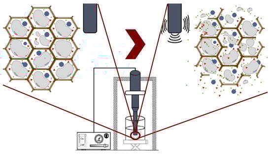 Ultrasound technology is widely used in the food industry because it can be used either as a pretreatment or can be combined with different types of solvents [,]. Ultrasound comprises mechanical waves, ranging from 20 kHz up to 10 MHz, involving various phenomena such as shear forces, compression pressure gradients, agitation, rarefaction, vibration, microjets, radical formation, and cavitation []. UAE utilizes soundwaves to disintegrate the cell structure for the subsequent release of compounds. Cavitation is the main force driving ultrasound extraction: it is a hydrodynamic effect that occurs when vapor cavities are created within the liquid, and different pressure forces are present []. These processes produce the expansion and implosive collapse of microbubbles, formed via a series of compressions and rarefactions in molecules generated by ultrasound waves, improving heat and mass transfer along the system and improving solvent penetration and cell-wall breaking. The main advantages of UAE are its reduced solvent consumption, shorter extraction time, lower operational costs, minimal impact on the stability of the target compounds because high temperatures are not required, and higher process efficiency and extraction yields compared with conventional extraction methods [,]. Figure 7 shows the general scheme of ultrasound-assisted extraction from seaweed tissues.