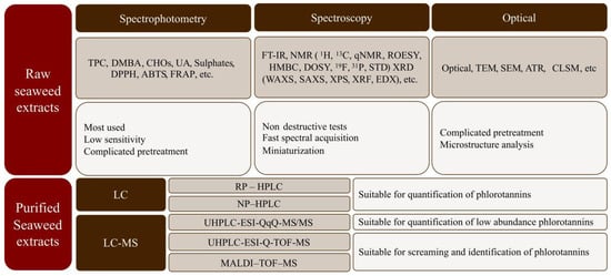 The chemical characterization of both crude and purified compounds from seaweeds is relevant in food engineering, medicine, and pharmacy to understand their bioactivities and beneficial health properties []. Nevertheless, isolation is often difficult due to their diverse molecular weights, structural similarities, and rapid reactivities [,]. Seaweed extracts are composed of a large, diverse, and complex mixture of compounds, where the phlorotannins are found together with polysaccharides, proteins, and other compounds. Initially, raw characterization is commonly carried out via spectrophotometric assays that are simple, cheap, and rapid, which enables comparison among studies [,]. Additionally, nuclear magnetic resonance (NMR), Fourier transform infrared spectroscopy (FT-IR), Matrix-assisted laser desorption ionization-time of flight mass spectrometry (MALDI-TOF-MS), and chromatographic techniques (HPLC and/or UPLC) have been reported as more reliable techniques for seaweed extract characterization because they allow qualitative and quantitative estimation []. Figure 8 shows a summary of the analytical methods often used for the characterization of seaweed biopolymers.