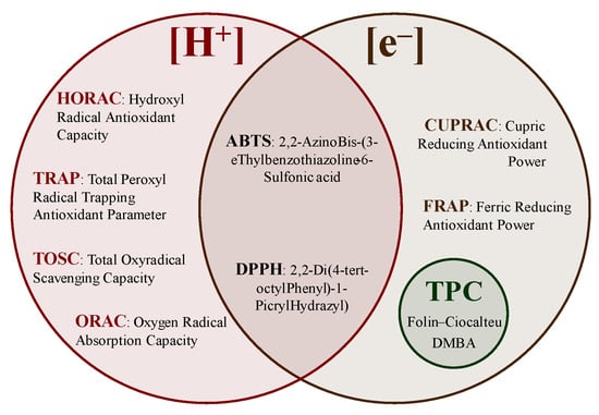 The background of the methods used to understand the reaction mechanisms of antioxidants and the advantages and limitations of the different tests are described in this section. Spectrophotometric methods rely on the linear relationship between absorbance and concentration using the coloration/discoloration of a solution measured at a specific wavelength []. Currently, the available methods can be divided based on the transfer of hydrogen atoms ([H+]), electrons ([e−]), and/or a mixture of both (Figure 9), such as hydroxyl radical antioxidant capacity (HORAC), total radical-trapping antioxidant parameter (TRAP), total oxyradical scavenging capacity (TOSC), oxygen radical absorption capacity (ORAC), 2,20-azinobis-(3-thylbenzothiazoline-6-sulfonic) acid (ABTS), 2,2-di(4-tert-octylphenyl)-1-picryl hydrazyl radical) (DPPH), cupric-reducing antioxidant power (CUPRAC), Ferric-reducing antioxidant power (FRAP), and the TPC determinations [,,,,].