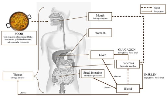 Starch digestion takes place in the mouth and mainly in the small intestine through the action of several enzymes. Throughout the digestion of starch and other carbohydrates, α-amylase and α-glucosidase are the two key enzymes involved. α-amylase is secreted by the salivary glands and the pancreas, and it catalyzes the hydrolysis of the α-D-1,4 glycosidic linkages of starch, generating shorter oligosaccharides []. α-glucosidase completes starch digestion and catalyzes the hydrolysis of these oligosaccharides into smaller and absorbable sugars as glucose []. Glucose is absorbed in the small intestine brush border and transported by the bloodstream to the tissues for its use and/or storage. Starch is not present as an isolated structure within the plant–cell matrix; it is often associated with other macronutrients, such as lipids or proteins, which can overall affect the digestion rate [].