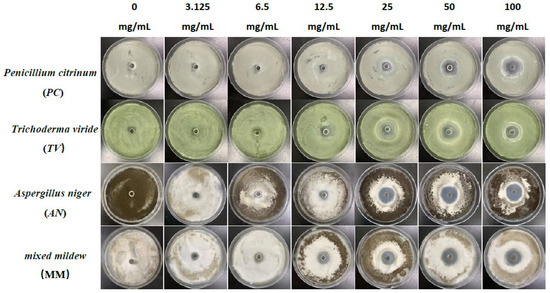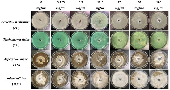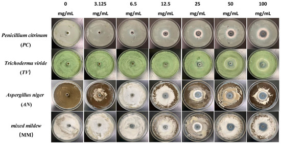 AN), and mixed mildews (MM) at six different concentration gradients. The inhibition rate was calculated based on the inhibitory zone diameter to characterize the strength of the antimildew ability of the three phenolic compounds. The experimental results are shown in