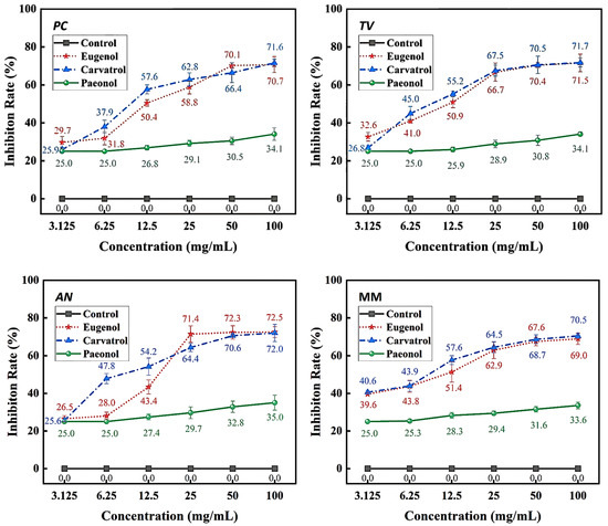 Additionally, at low concentrations (3.125 mg/mL and 6.25 mg/mL), eugenol and carvacrol show lower inhibition rates against AN, but as the concentration increases, the inhibition rates significantly improve. Specifically, at concentrations of 50 mg/mL and 100 mg/mL, eugenol’s inhibition rates reach 72.3% and 72.5%, respectively, while carvacrol’s inhibition rates reach 70.6% and 72.0%, respectively. In comparison, paeonol exhibits a relatively lower increase in inhibition rate, demonstrating a significant inhibitory effect only at a concentration of 12.5 mg/mL, with the highest inhibition rate being only 35.0%.