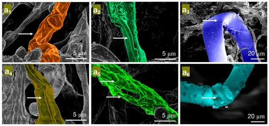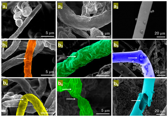 2) exhibit an increased roughness on the hyphal surface, shriveled and wrinkled hyphae;