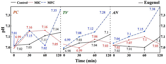 Figure 8, different concentrations of eugenol can affect the extracellular pH of bamboo mildews. In the control group, the extracellular pH of bamboo mildew changed very little or remained unchanged. Within the 0–60 min treatment range, the extracellular fluid pH of the treated mildew groups showed an overall increasing trend, indicating leakage of intracellular metal ions and other alkaline components to the extracellular fluid, leading to cell acidification, intracellular H+ accumulation, and irreversible damage to intracellular physiological and biochemical processes. After 60 min, the extracellular fluid pH of mildew strains treated with MIC began to decline gradually, which may be due to self-regulation by the cell in an attempt to maintain the balance of intracellular and extracellular fluid environments by secreting acid. The extracellular fluid pH of mildew strains treated with MFC showed a more significant increase, possibly due to severe cell membrane damage in bamboo mildews, rendering the cell unable to restore acid secretion balance. As shown in