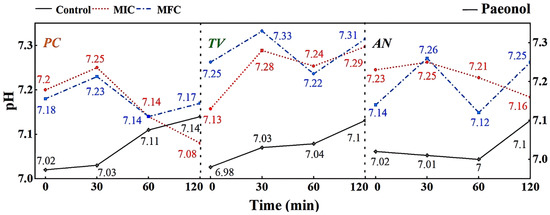 Figure 10, it can be observed that different concentrations of gambierol can affect the extracellular pH of bamboo mildew. Within the treatment range of 0–30 min, the pH of the extracellular fluid of the treated strains generally showed an upward trend, indicating that alkaline components, such as metal ions, leaked out of the cells. This may be due to the fact that the gambierol treatment destroyed the membrane structure of bamboo mildew, affecting the function of ion channels. After 30 min, the extracellular fluid pH of the treated strains showed a downward trend, possibly because the cells began to release protons outside to maintain the balance of the intra- and extracellular environment. Within the treatment range of 60–120 min, the extracellular fluid pH of the strains treated with MFC increased again. Combined with the results of electron microscopy, it was found that the structure of the treated mildew hyphae was severely damaged, and intracellular substances were lost to a large extent. It was suggested that gambierol might further damage the membrane and wall structures of bamboo mildew, causing alkaline substances, such as cytoplasmic matrix, mitochondrial matrix, vacuoles, nucleoli, amino acids, nucleotides, calcium ions, and sodium ions, to leak out of the cells.