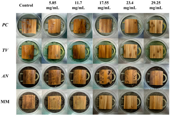According to the evaluation criteria for antimildew properties of engineered wood, five different concentrations of carvacrol were selected for testing: 3 times (5.85 mg/mL), six times (11.7 mg/mL), nine times (17.55 mg/mL), 12 times (23.4 mg/mL), and 15 times (29.25 mg/mL) the minimum fungicidal concentration (MFC), respectively, to treat sliced bamboo veneers for antimildew purposes. The results obtained on the 28th day of the antimildew test are shown in