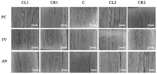 In summary, on the 28th day of the mildew prevention experiment, the carvacrol solution with a concentration of 29.25 mg/mL can achieve a mildew growth grade of 1 on the surface of the specimens of sliced bamboo veneers against MM, indicating that this concentration has a good mildew prevention effect against MM; while for the other three mildews, the inhibition effect is more significant, and the carvacrol solution with a concentration of 29.25 mg/mL can achieve a mildew growth grade of 0 on the surface of the specimens of sliced bamboo veneers against PC, TV, and AN, respectively. Therefore, the concentration of 29.25 mg/mL carvacrol can be used as the optimal impregnation concentration for the mildew prevention treatment of sliced bamboo.