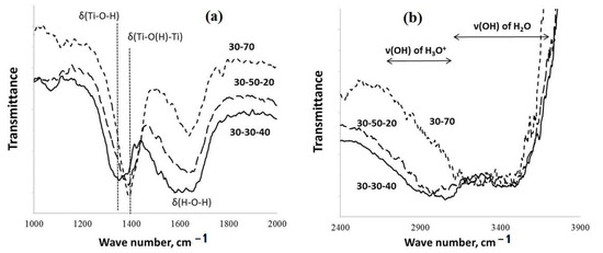 The data of FT-IR spectroscopy indicate (Figure 3) that the increased contents of KOH in the molten KOH-KNO3 mixtures used for the PPT synthesis support increased [(Ti-O(H)-Ti)] in comparison with [Ti-O-H]; the maximum of the absorption band at 1350 cm−1 (attributed to δ(H-O-H)) shifts to 1400 cm−1 (attributed to δ(Ti-OH) and δ(Ti-O(H)-Ti)) [28,29,30].