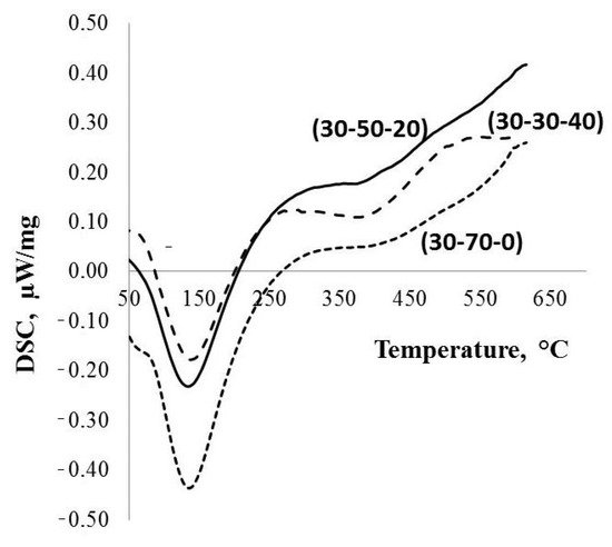 The DTA data (Figure 4) indicate that all of the investigated types of the PPT are characterized by the presence of different forms of water: (1) physically adsorbed, corresponding to the endothermic peak at ~150 °C, and (2) chemically adsorbed, related to a wide endothermic peak with a maximum at about of 390 °C. In addition, the quantity of physically adsorbed water decreases in the order of PPT(30-70-0), PPT (30-50-20), and PPT (30-30-40) (Table 1).