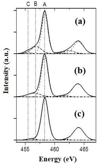 XPS spectra in the energy range of Ti2p for the specimens of PPT (30-70-0) (a), PPT(30-50-20) (b), and PPT (30-30-40) (c). A: 2p(3/2) Ti4+; B: 2p(3/2) Ti3+; C: 2p(3/2) Ti2+.