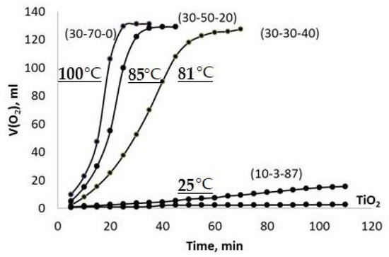 The obtained results indicate that the dilution of the hydrogen peroxide aqueous solution with water reduces the rate of H2O2 chemical decomposition and inhibits the heating of the dispersions obtained. However, these effects are more pronounced for the PPT (30-70-0) powder. On the other hand, it is important to note that the rate of oxygen generation can be approximately constant at a certain concentration (dilution) of H2O2 aqueous solutions.