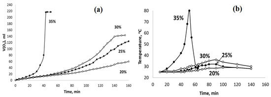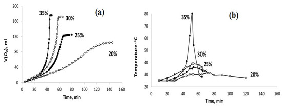 The sets of the observed V(O2)-t (a) and T–t (b) plots obtained using the PPT (30-70-0) catalyst and the H2O2 aqueous solutions of different concentrations (marked in %).