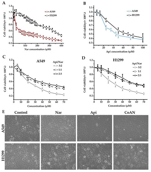 The cell viability detection. (A–D) involve the cell cytotoxicities measured with CCK8 assay. A549 (A) and H1299 (B) cells were incubated for 24 h using 0–100 μM of Api or 0–400 μM Nar, respectively. A549 (C) and H1299 (D) cells were incubated for 24 h using 0–70 μM of CoAN (the Api to Nar ratio was 3:2, 1:1, or 2:3), respectively. (E) The morphology of A549 and H1299 cells after 28.7 μM and 32.5 μM of Api, Nar, or both (CoAN, A:N = 3:2) treatments for 24 h, respectively. Api: Apigenin, Nar: Naringenin.