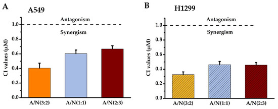 The antiproliferative effect of Nar, Api, or CoNA was determined on A549 and H1299 cells using the CCK8 assay. A549 and H1299 cells were incubated for 24 h with 0–100 μM of Api or 0–400 μM Nar, respectively. As represented in Figure 1A, 6.25, 12.5, 25, and 50 μM of Nar showed the effects of promoting H1299 cell growth. However, the stimulatory effects were reduced with increasing Nar concentration and returned to basal level at 100 μM of Nar. The IC50 values of Nar were 143.3 ± 3.1 μM and 370.1 ± 4.9 μM for A549 and H1299 cells, respectively. The IC50 values of Api were 45.7 ± 1.3 μM and 69.8 ± 2.5 μM in the A549 and H1299 cells, respectively. However, CoAN treatment elevated toxicity in A549 and H1299 cells more than either the Nar or Api alone. At a 3:2 (A:N) combination ratio, the IC50 was 28.7 ± 0.9 μM and 32.5 ± 3.9 μM for A549 and H1299 cells, respectively. These were significantly lower than either 1:1 or 2:3 ratios (Figure 1C,D).