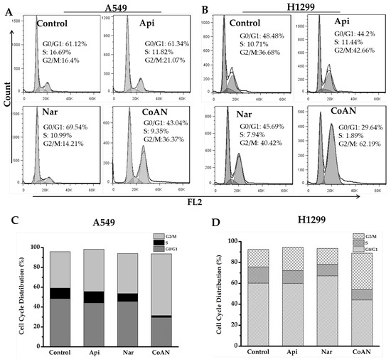 The cell cycle analysis of the A549 and H1299 cells after 28.7 μM and 32.5 μM of Api, Nar, or both (CoAN) treatments for 24 h, respectively. (A,B) are representative diagrams of the cell cycle phases. (C,D) are the statistical data of the cell cycle phase distributions in A549 and H1299 cells.
