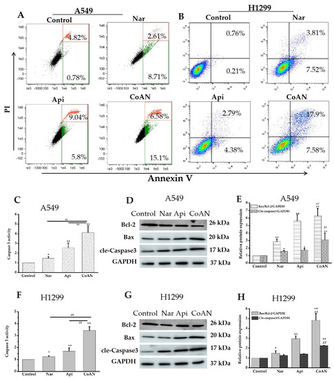 The cell apoptosis detection. A549 and H1299 cells were exposed to 28.7 µM and 32.5 µM of Api, Nar, or both (CoAN), respectively. (A,B) are the graphs representing apoptosis detected using flow cytometry. (C,F) are the relative Caspase 3 activities. (D,G) are the Bcl-2, Bax, and GAPDH protein expression products. (E,H) are the statistical data of the gray value of Bax/Bcl-2/GAPDH and cleaved-Caspase 3/GAPDH. * p < 0.05 and ** p < 0.01 vs. control. ## p < 0.01 vs. Api or Nar.