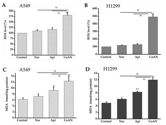 The malonaldehyde (MDA) content was used to quantify lipid peroxidation. The MDA contents and ROS levels in A549 and H1299 cells were determined after 24 h of treatment with 28.7 µM and 32.5 µM of Api, Nar, or both (CoAN), respectively. As shown in Figure 5A,B, Api or Nar treatment did not significantly (p > 0.05) improve the ROS levels in the cell lines compared to the control. The MDA concentration was not (p > 0.05) elevated in A549 cells. However, it was significantly (p < 0.05) enhanced in H1299 cells using Nar treatment, compared to the controls. Moreover, compared to the controls, MDA concentrations were remarkably improved using Api treatment in both cell lines. Furthermore, the CoAN treatment significantly (p < 0.01) increased ROS levels and MDA contents in the cell lines relative to the control, Api, or Nar.