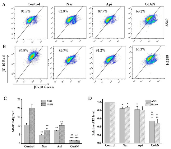 Mitochondria are the prominent energy-producing organelle of eukaryotic cells. The mitochondrial membrane potential (MMP) change and ATP production can assess the mitochondrial function within cells. A549 and H1299 cells were treated with 28.7 µM and 32.5 µM of Api, Nar, or both (CoAN) for 24 h, respectively. As shown in Figure 6A,B, Api or Nar treatment significantly (p < 0.01) decreased the MMP in both cell lines compared to the control. Intriguingly, CoAN treatment significantly (p < 0.01) decreased MMP compared to Api or Nar alone (Figure 6C). ATP levels were further analyzed, indicating that CoAN treatment (p < 0.01) reduced the ATP synthesis compared to the controls in both cell lines, Api or Nar alone (Figure 6D). Therefore, CoAN promotes mitochondrial dysfunction leading to cell apoptosis.